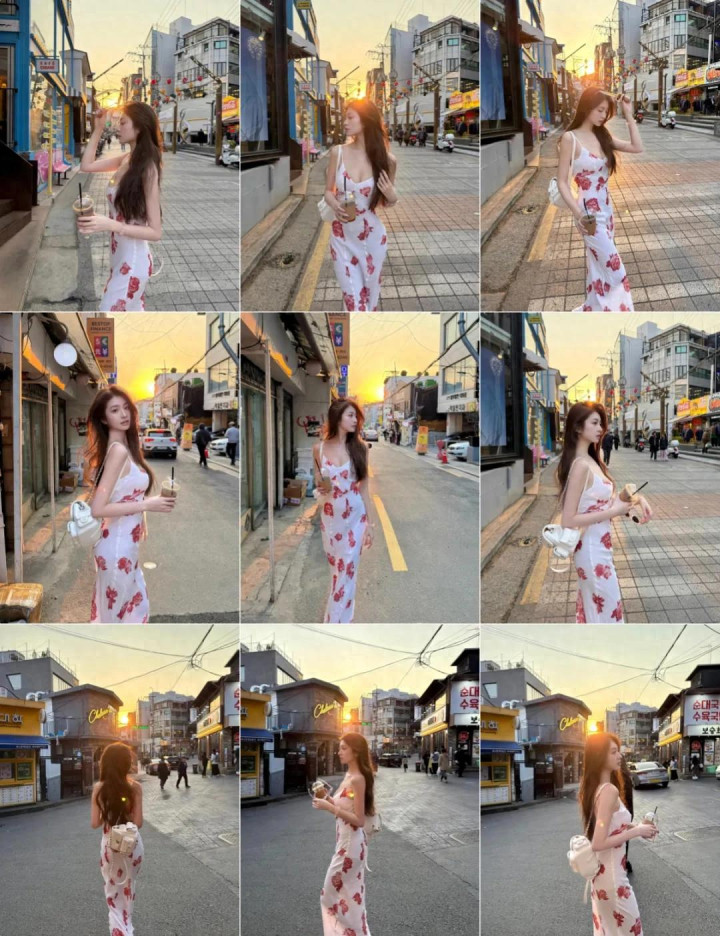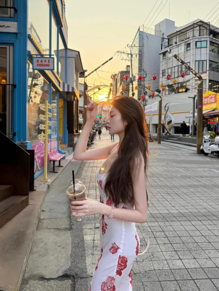 穿长裙拍照时可以加一个小跨步动作,侧身拿着咖啡往前走,低头的同时一只手扶一下墨镜,这个动作自然又不夸张,很适合穿长裙旅行拍照,照片看起来像街拍一样随意,却很好看。