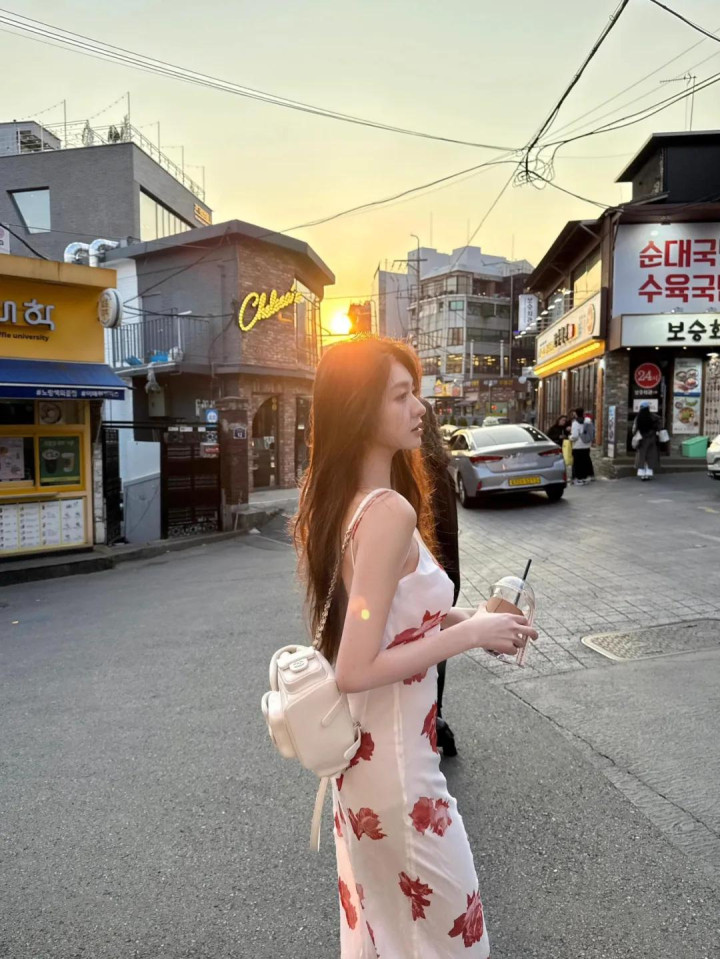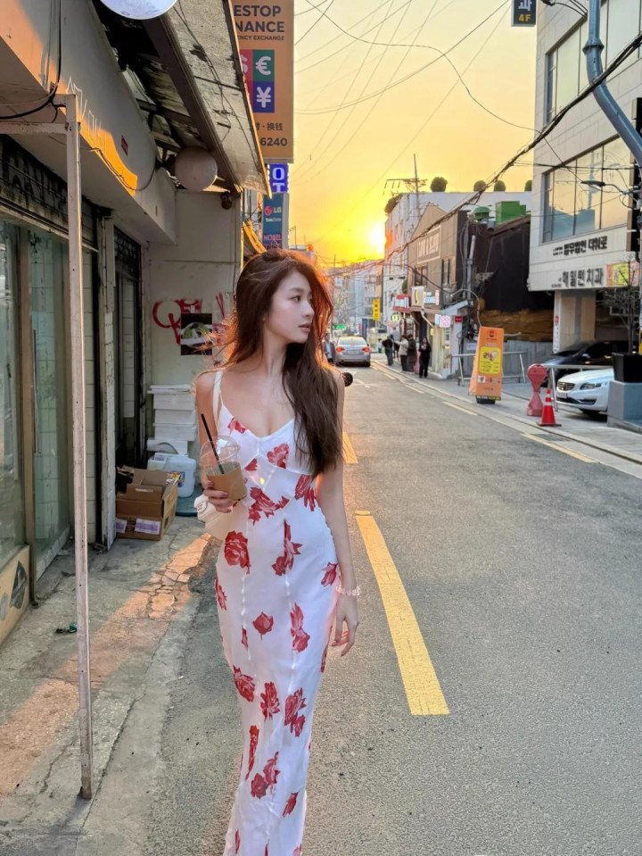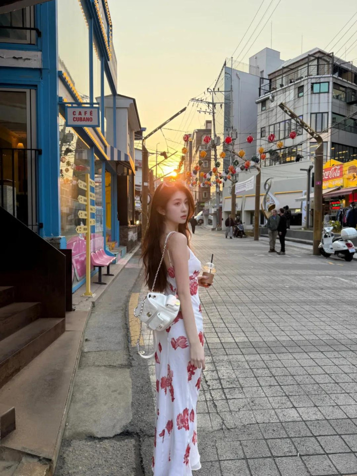穿长裙拍照可以一边走一边拍,步子放慢,裙摆会自然晃动,手里拿着咖啡往前走,头轻轻转向一边不看镜头,这样穿长裙旅行拍照会显得很生活化,照片看起来随意却很大方,也很有旅行感。