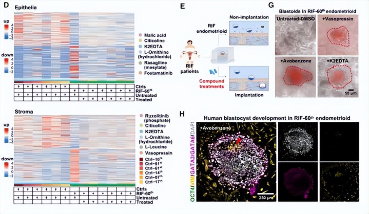 值得关注的是,研究人员采用经过伦理审批后的科研捐赠的人类真实胚胎,验证了化合物处理后可提升了RIF的植入率。经阿伏苯宗处理后,人类胚胎可在RIF-60号患者子宫内膜样细胞中发育至植入后早期阶段。