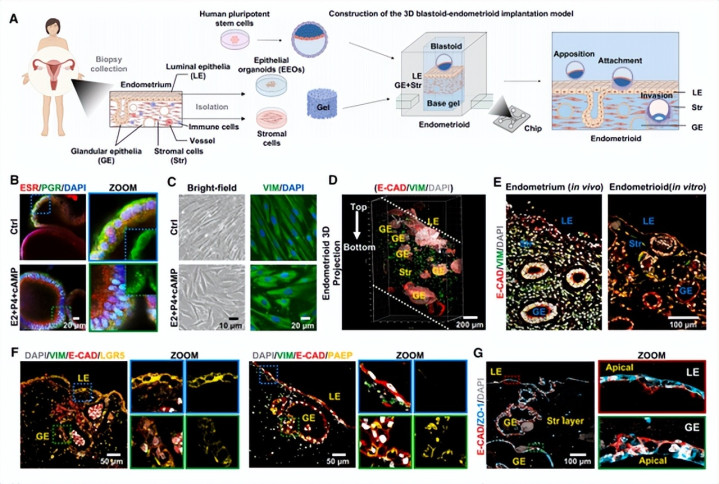 起初,研究团队尝试采用子宫内膜类器官的仿制策略,但由于它并不是3D结构,因此与真实的子宫环境存在差异。为构建出与体内环境相似的模拟结构,研究人员使用了组织工程的方法进行尝试。