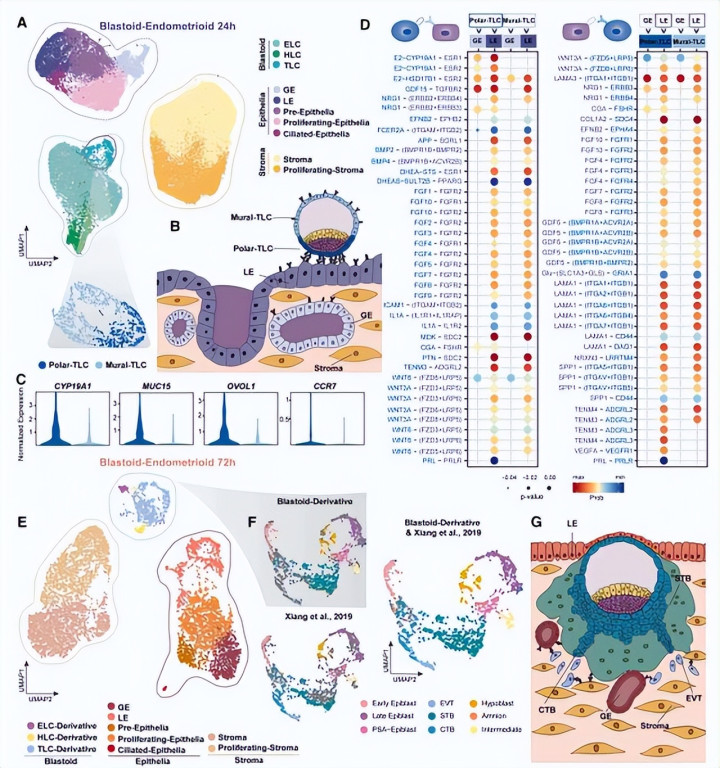 对侵入后72小时样本的分析,进一步揭示了滋养层细胞衍生物与子宫内膜各细胞类型之间更为精细和特异的互作网络,进而填补了人类胚胎植入机制认知空白。