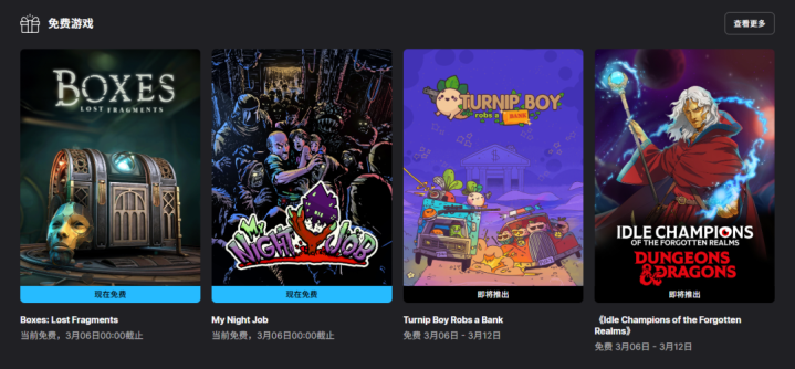 本周Epic商店送出的游戏是《盒子:丢失的碎屑》和《我的夜间使命》,两个齐撑抓中语,领取时刻限度到3月06日0点。