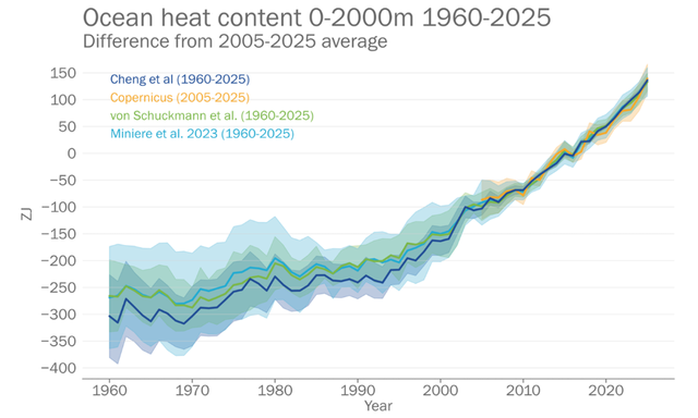 △全国风光组织发布的《1960-2025年公共海洋2000米深处的年热含量表》;单元:泽塔焦耳(ZJ)