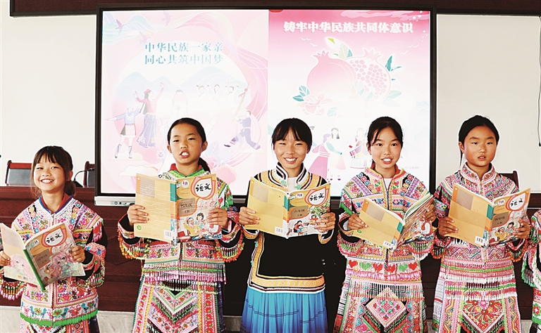 贵州省毕节市黔西市铁石苗乡彝乡铁石小学的同学们用国度通用谈话朗诵课文。熊万军摄/光明图片