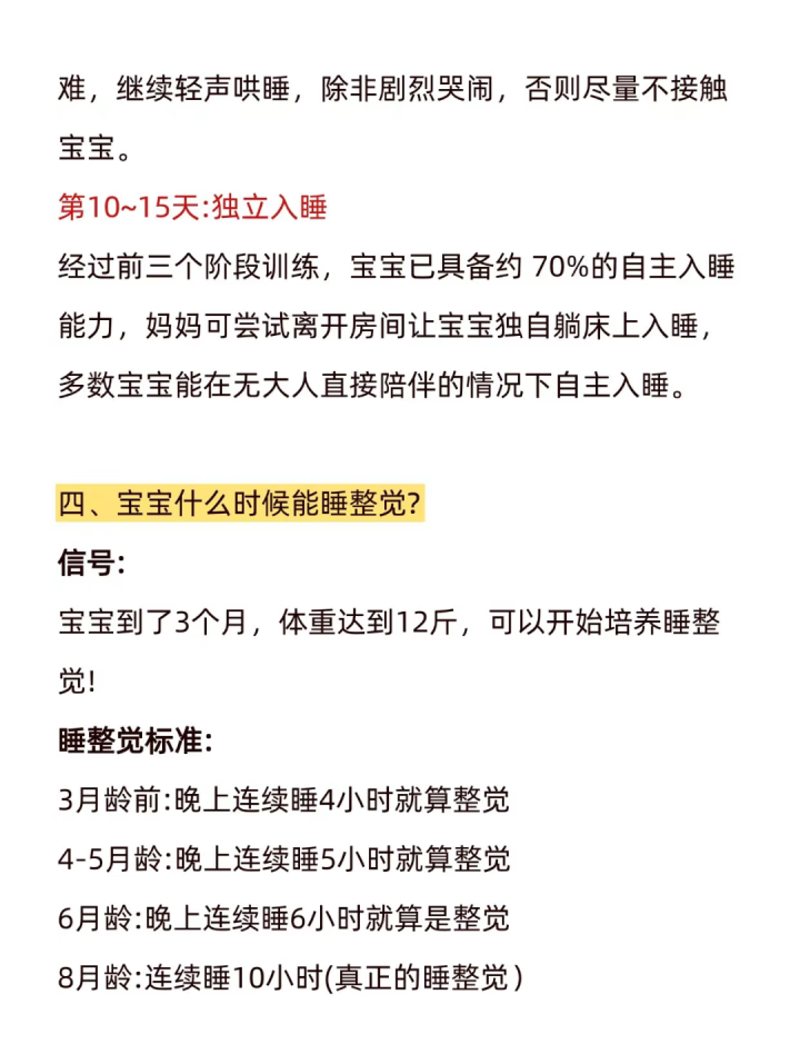 至于爸爸妈妈都很关心的“睡整觉”,一般在宝宝满三个月、体重达标后就可以开始培养了。不过要知道,对小宝宝来说,“整觉”的时间标准和大人不一样。几个月大的宝宝能连续睡上四五个小时,就已经非常棒了!随着宝宝长大,他们连续睡眠的时间会越来越长,到了八九个月,很多宝宝就能一觉睡到大天亮了。