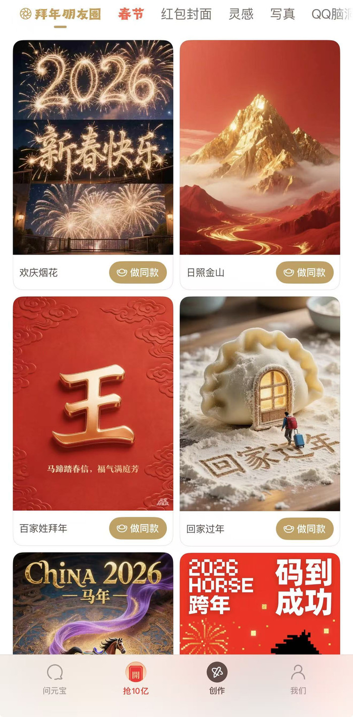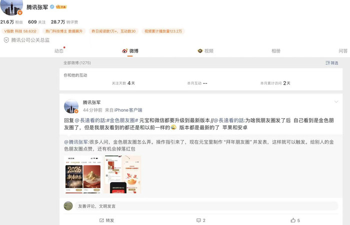 2月16日上昼,腾讯公关总监张军在微博账号发文称:“好多东谈主问,金色一又友圈怎么弄。操作指引来了,当今元宝里制作“贺年一又友圈”并发表,这么就不错触发。给别东谈主的金色一又友圈点赞,还有契机掉落红包。”