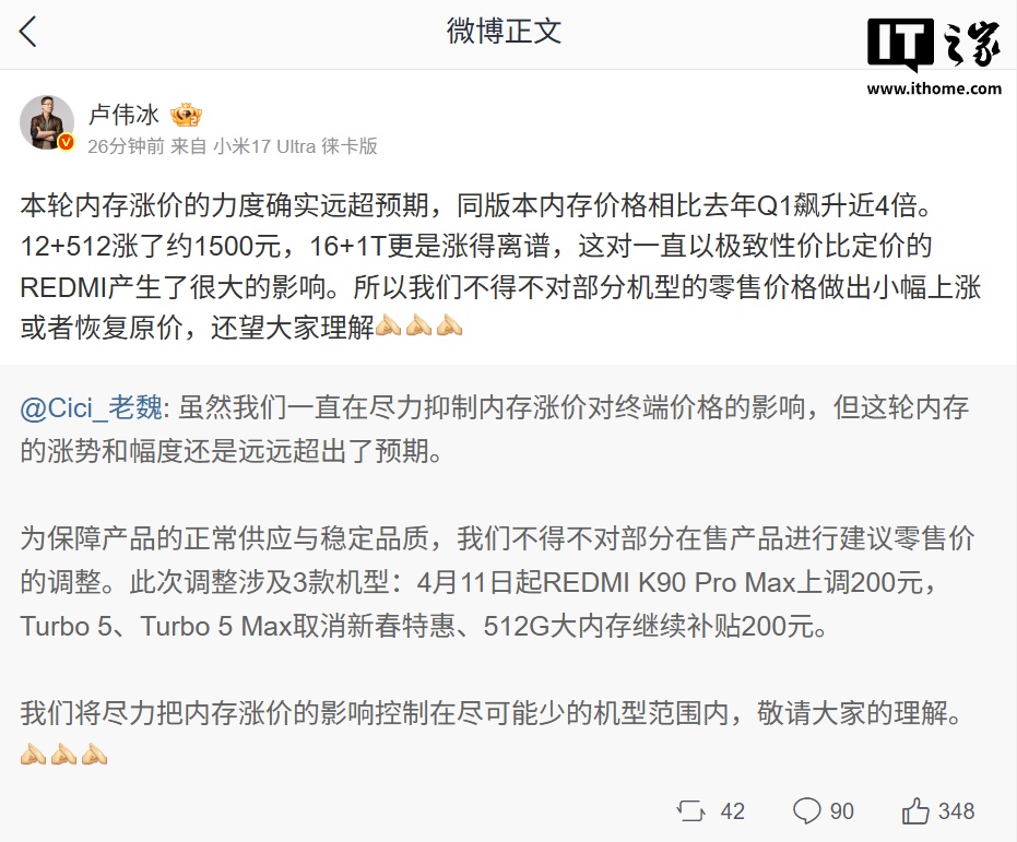 IT之家 4 月 3 日音问,小米本日发布对于 Xiaomi 及 REDMI 部分居品提议零卖价诊治的讲明,受大家存储芯片等重要零部件价钱捏续大幅飙升影响,经审慎评估,将自 2026 年 4 月 11 日 0 时起诊治部分在售居品的提议零卖价。